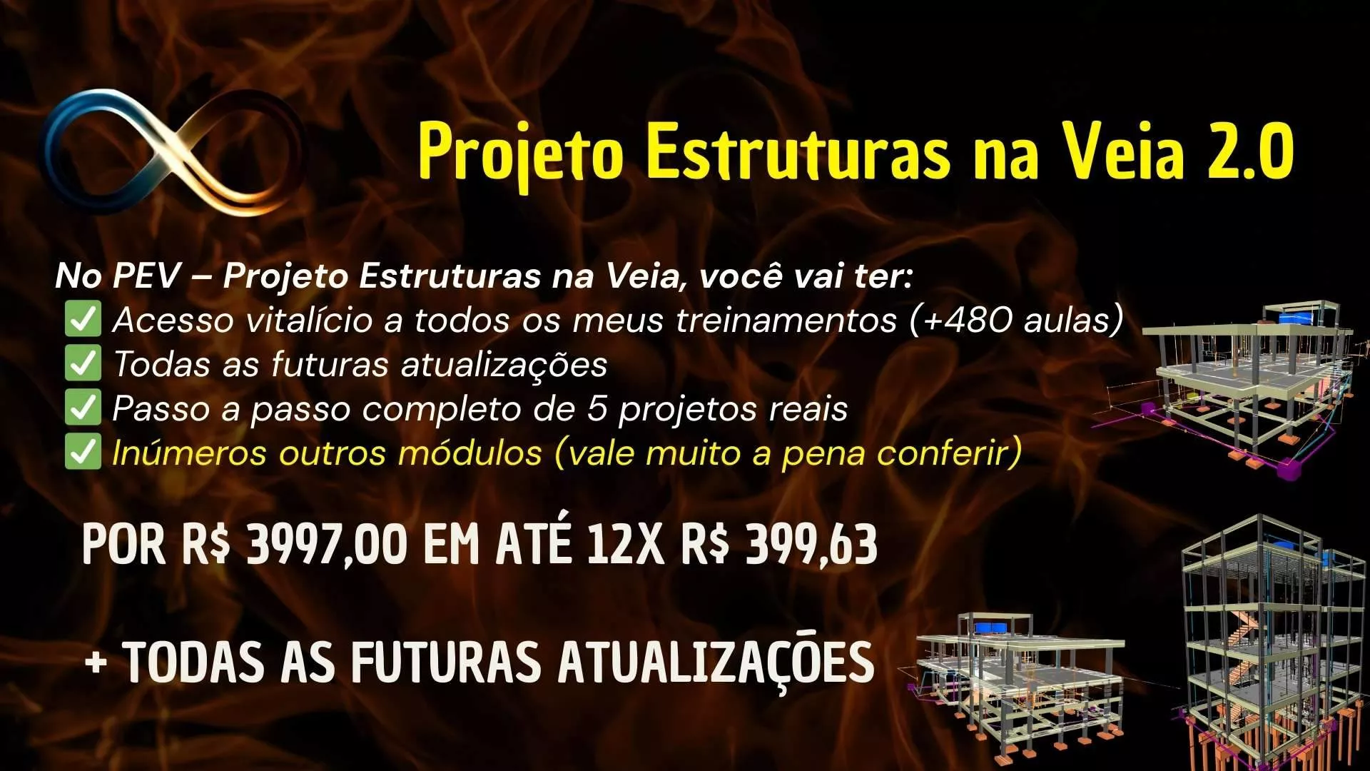 Módulos: Edição de armaduras, fundações profundas, piscinas, muro de arrimo, 05 projetos completos, Enciclopédia PEV (todas as lives) e muito mais.